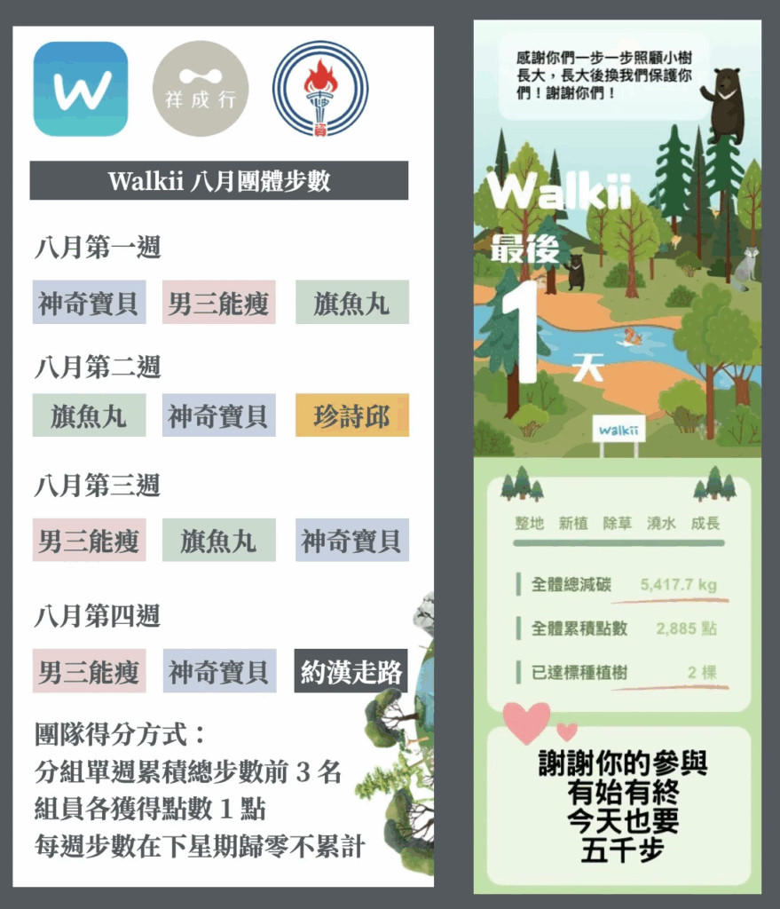 為了讓「身心永續」成為每位祥成人生活中的一部分,永續部門於七月正式與Walkii團隊合作,啟動了「Walkii 健康森林」計步挑戰,讓「CP值集點」活動以數位App方式具體呈現。