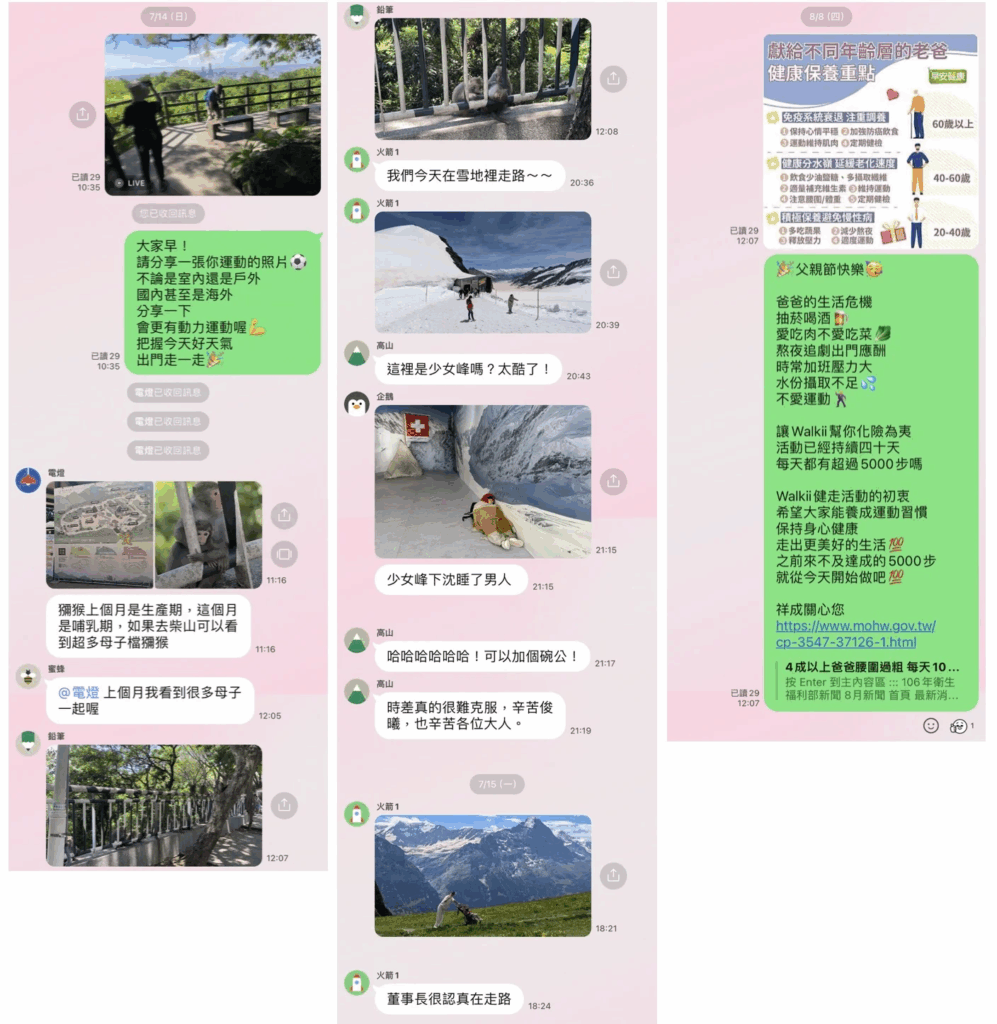 此外,為活動設立的 LINE 群組也成了大家分享訊息與心得的溝通平台。除了步數討論外,群組內還分享許多運動常識,推薦能增添運動樂趣的音樂歌單,甚至在中秋節期間傳達減塑減碳的環保理念。讓這次活動不僅是計步挑戰,更成為健康與永續意識的訊息發射站。